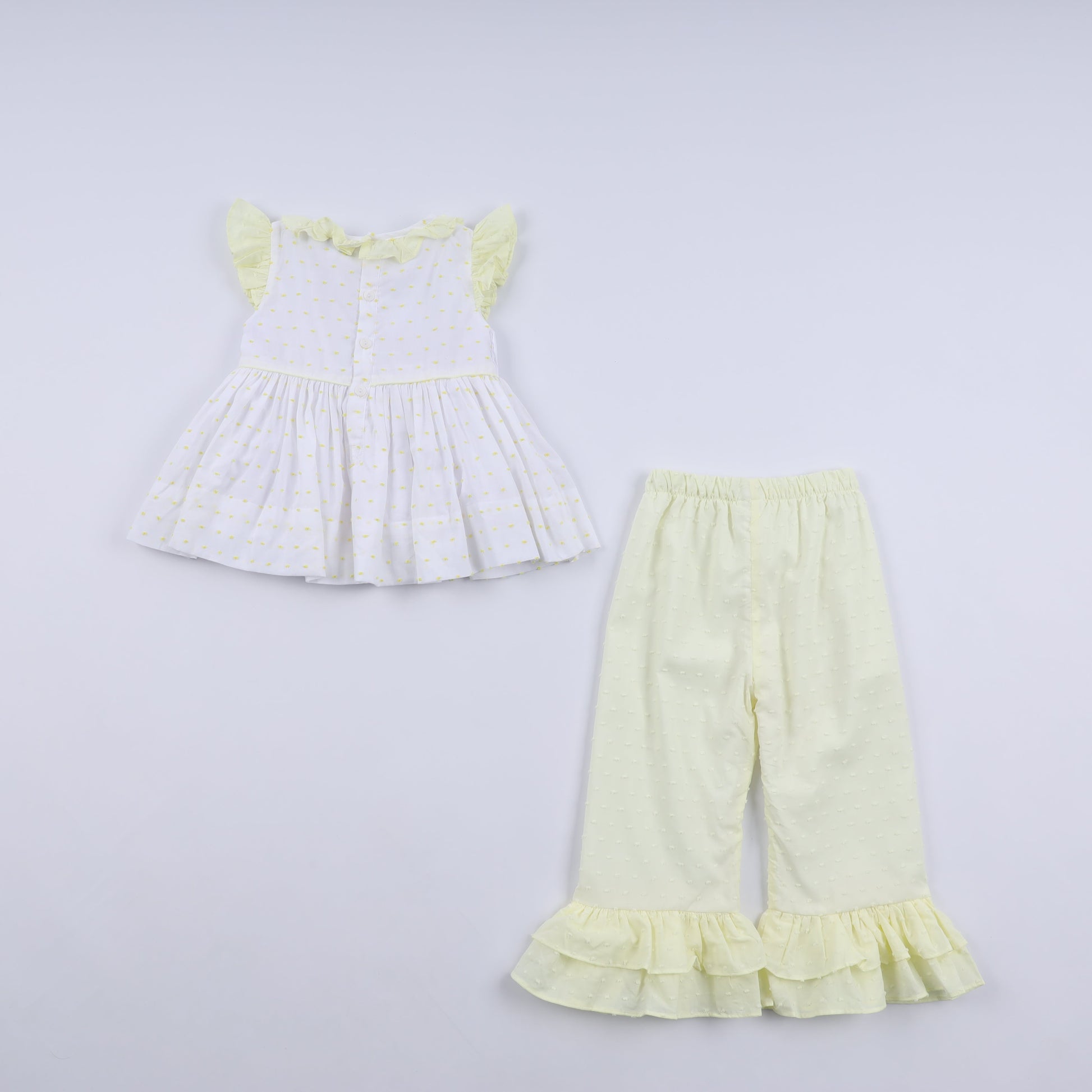 Adorable mustard-hued pants set featuring charming character details and hand-smocked ruffle accents. Perfect for little ones who love standing out with personality and style. The soft, breathable fabric keeps them comfy all day long, while the playful design makes getting dressed an adventure. Ideal for playdates, family gatherings, or everyday wear that brings smiles and giggles.