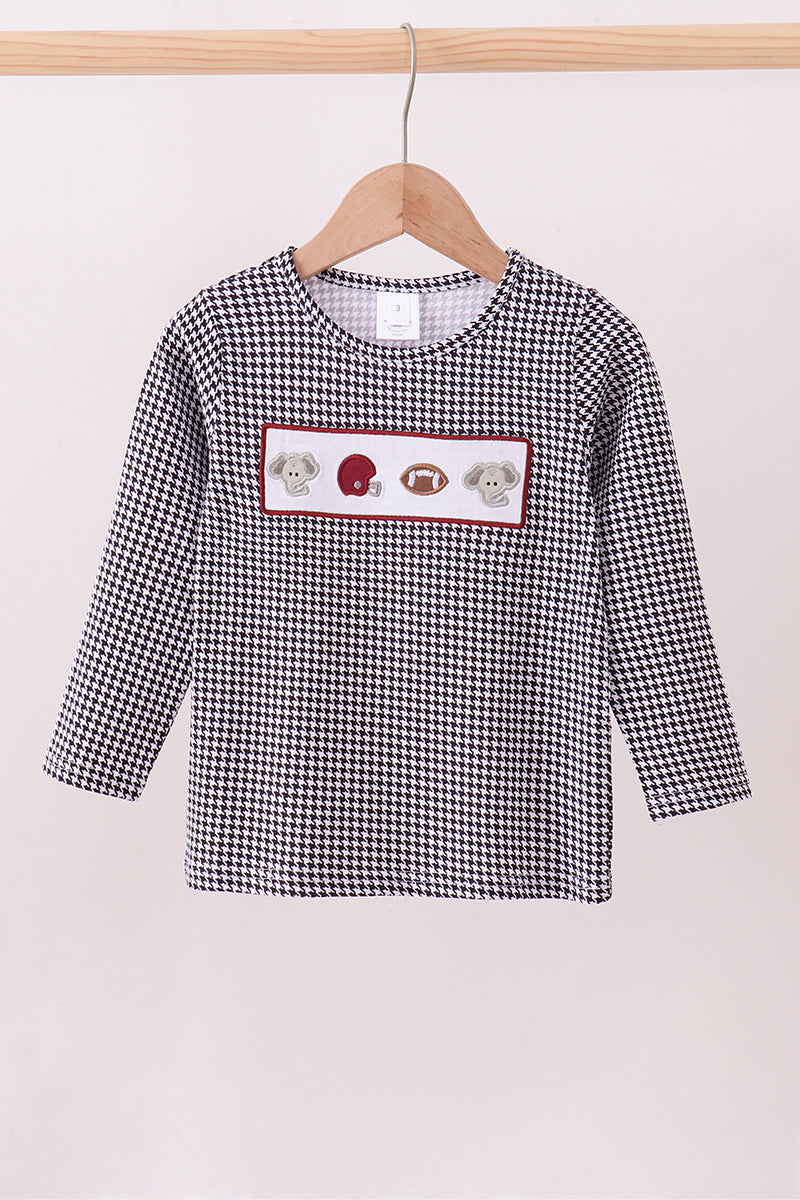 Elevate your wardrobe with this premium black top featuring an eye-catching Alabama elephant embroidery. Crafted with meticulous attention to detail, the embroidered design brings a touch of Southern charm and spirited pride to any outfit. Perfect for game days, casual outings, or whenever you want to showcase your love for the Crimson Tide in style. The quality construction ensures durability and comfort, making this a versatile staple that pairs effortlessly with jeans, skirts, or athletic wear. Show your colors with confidence and flair!