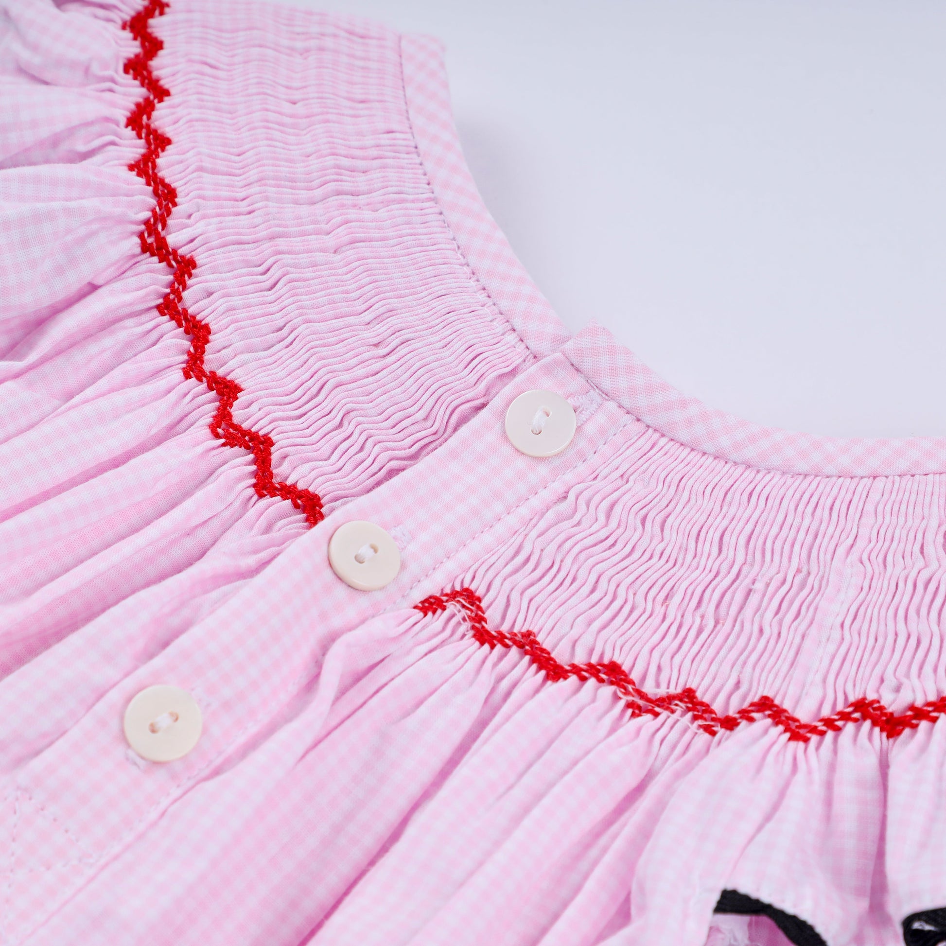 Red character hand smocked plaid ruffle bubble