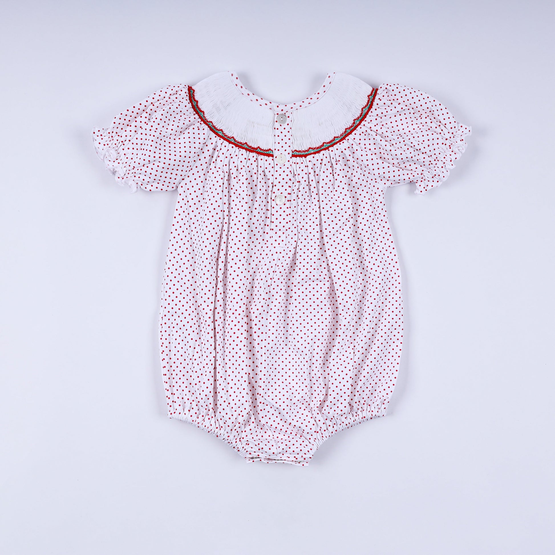 Adorable red gingerbread-inspired bubble featuring delicate hand-smocked detailing that adds charming texture and dimension. Perfect for little ones who love festive style with a playful twist. The smocking creates beautiful gathering across the bodice, while the cheerful gingerbread hue brings warmth and holiday cheer to any wardrobe. Comfortable and whimsical, this bubble is an instant favorite for special occasions or everyday fun.